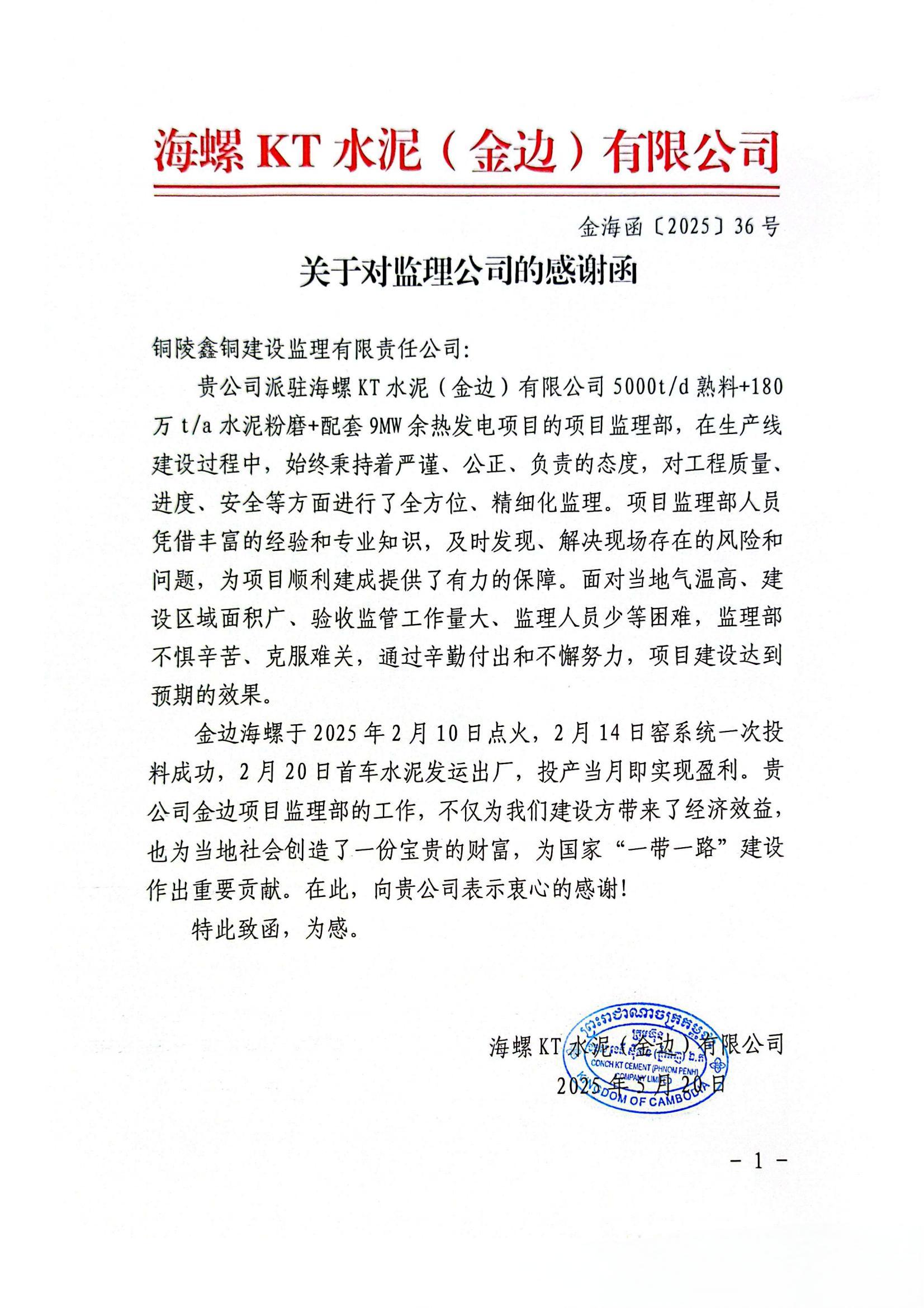 海螺KT水泥(金邊)有限公司特發(fā)感謝函,感謝公司在金邊海螺項目合作過程中的辛勤付出,對項目監(jiān)理部展現(xiàn)出的精湛業(yè)務(wù)能力和周到服務(wù)態(tài)度表示高度肯定。該項目的成功建成,彰顯了公司在海外項目監(jiān)理工作中的專業(yè)與擔當,未來,公司將繼續(xù)開拓外部市場,加強國際合作,為“一帶一路”建設(shè)貢獻更多力量。